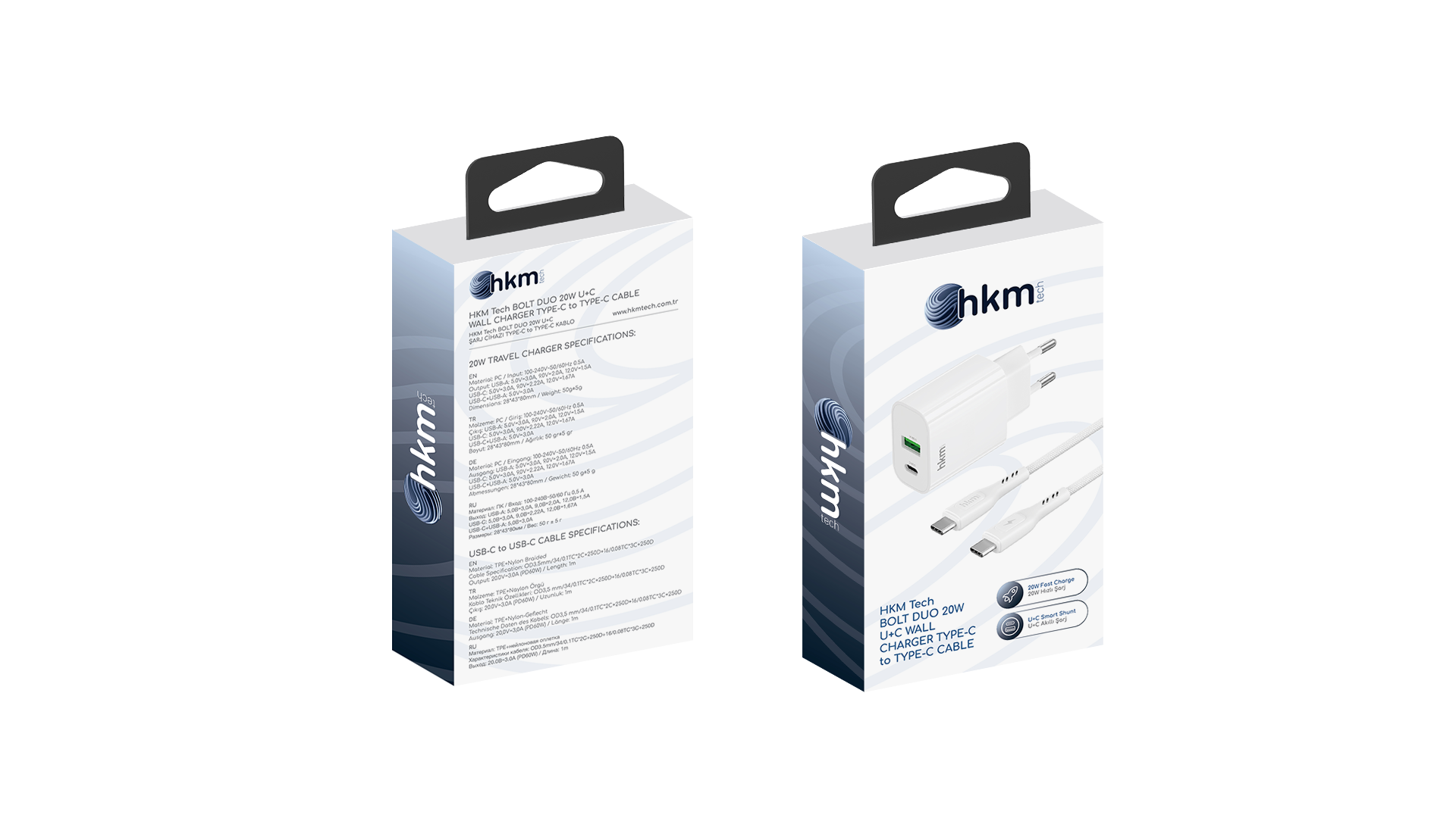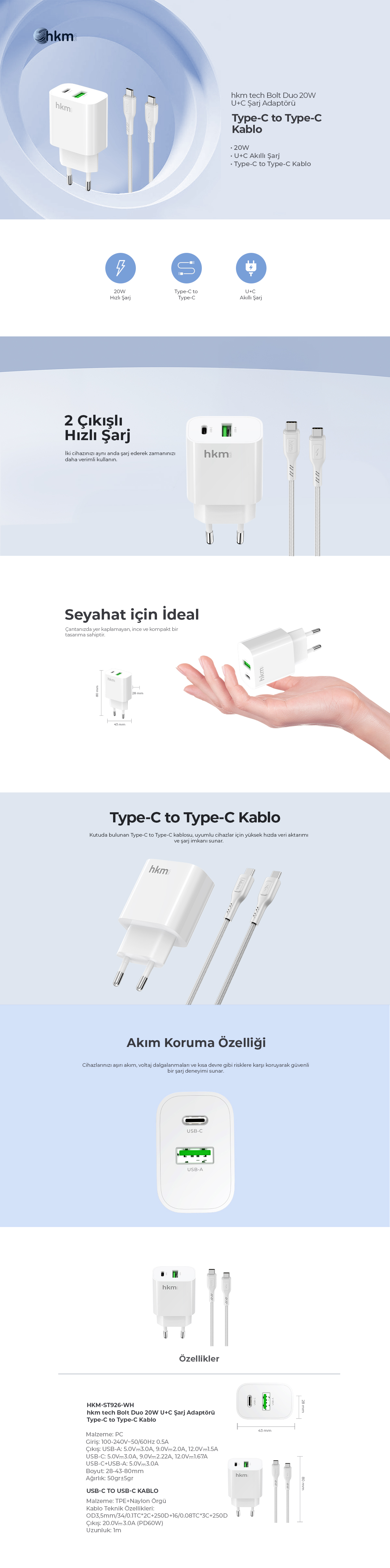 hkm tech BOLT DUO 20W USB-A ve Type-C Çift Portlu Hızlı Şarj Aleti ve Type-C Kablo Seti