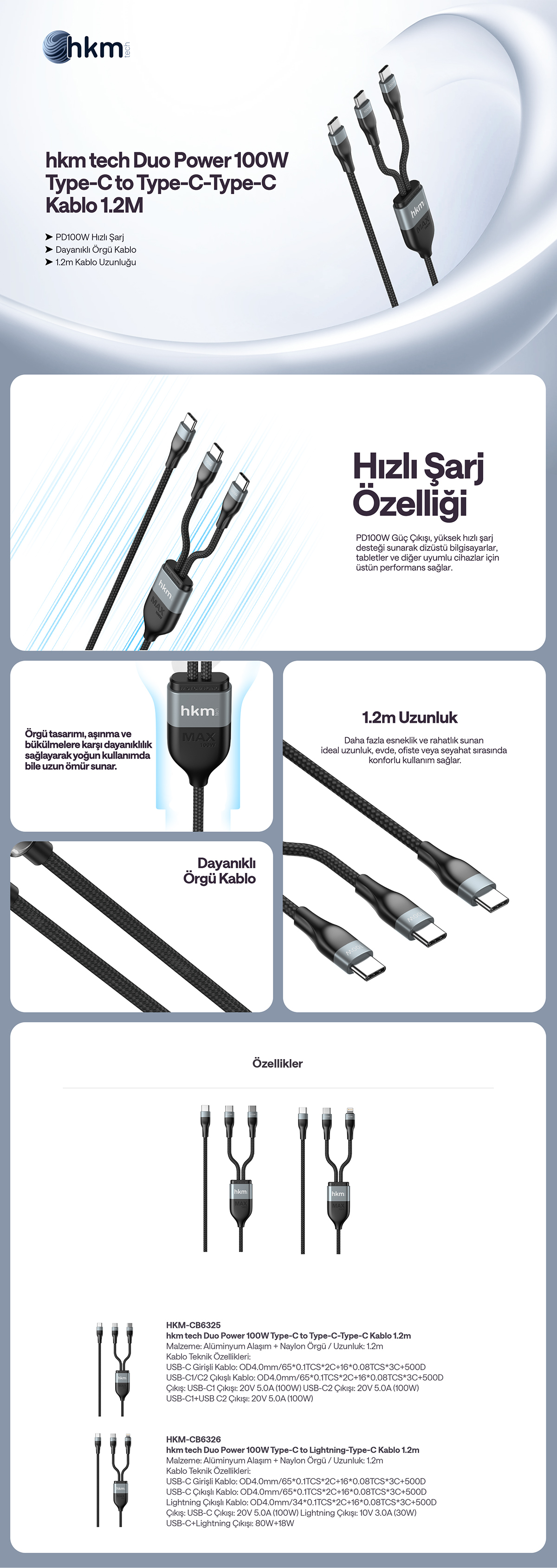 hkm Duo Power 100W Type-C to Type-C + Type-C Kablo, çoklu cihaz yönetimi, dayanıklılık ve performansı bir arada sunarak teknoloji tutkunlarının beklentilerini fazlasıyla karşılar. Her zaman güvenilir ve pratik bir kablo çözümü arıyorsanız, bu ürün mükemmel bir seçimdir.