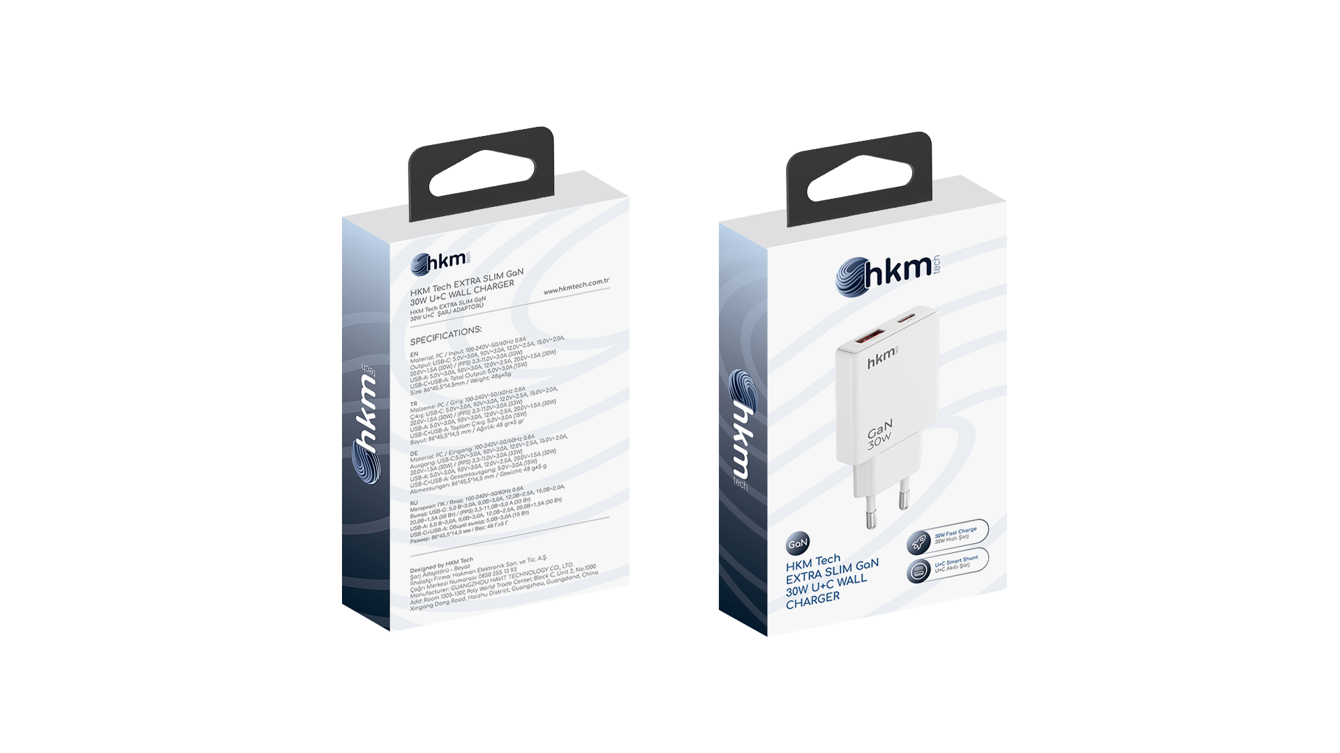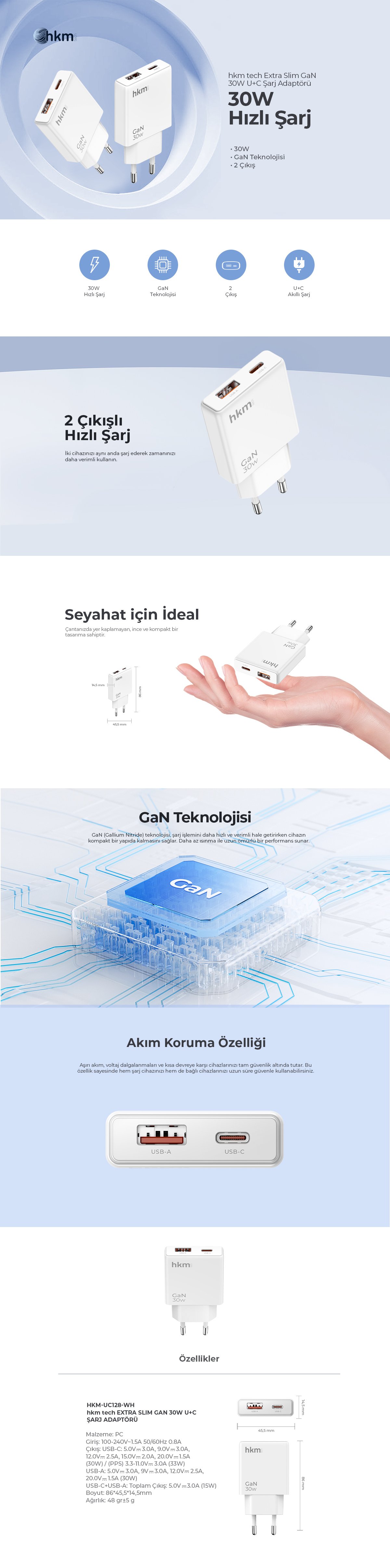 hkm tech EXTRA SLIM GaN 30W USB-A ve Type-C Çift Portlu Ultra İnce ve Hızlı Şarj Aleti