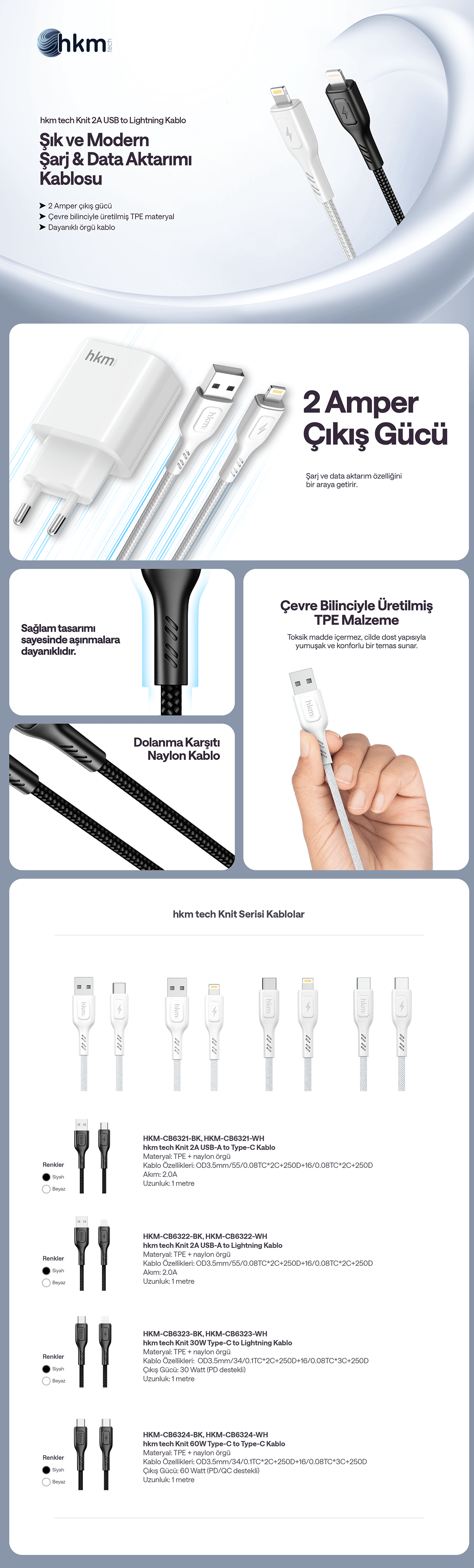 HKM Knit 2A USB to Lightning Cable, şarj ve veri aktarım ihtiyaçlarınıza mükemmel bir şekilde cevap verirken estetik ve dayanıklılığı bir araya getirir. Apple cihazlarınız için güvenilir bir aksesuar arıyorsanız, bu kablo tam size göre!
