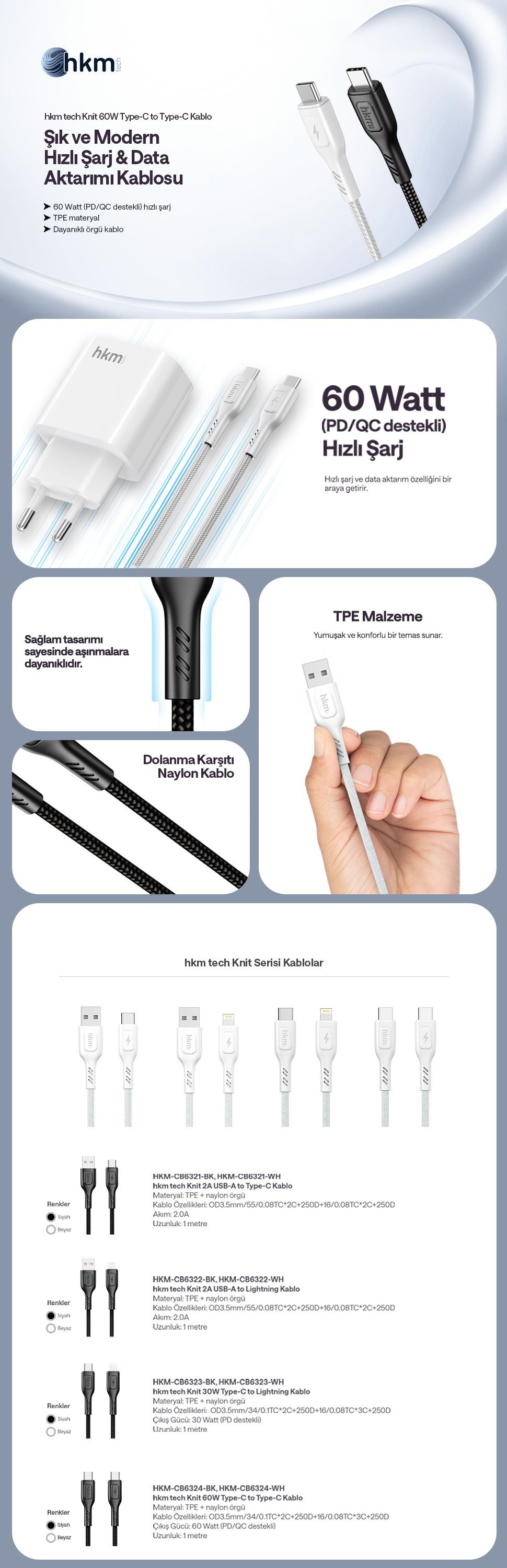 hkm tech KNIT 60W Hızlı Şarj Destekli, Type-C to Type-C Şarj ve Data Aktarım Kablosu