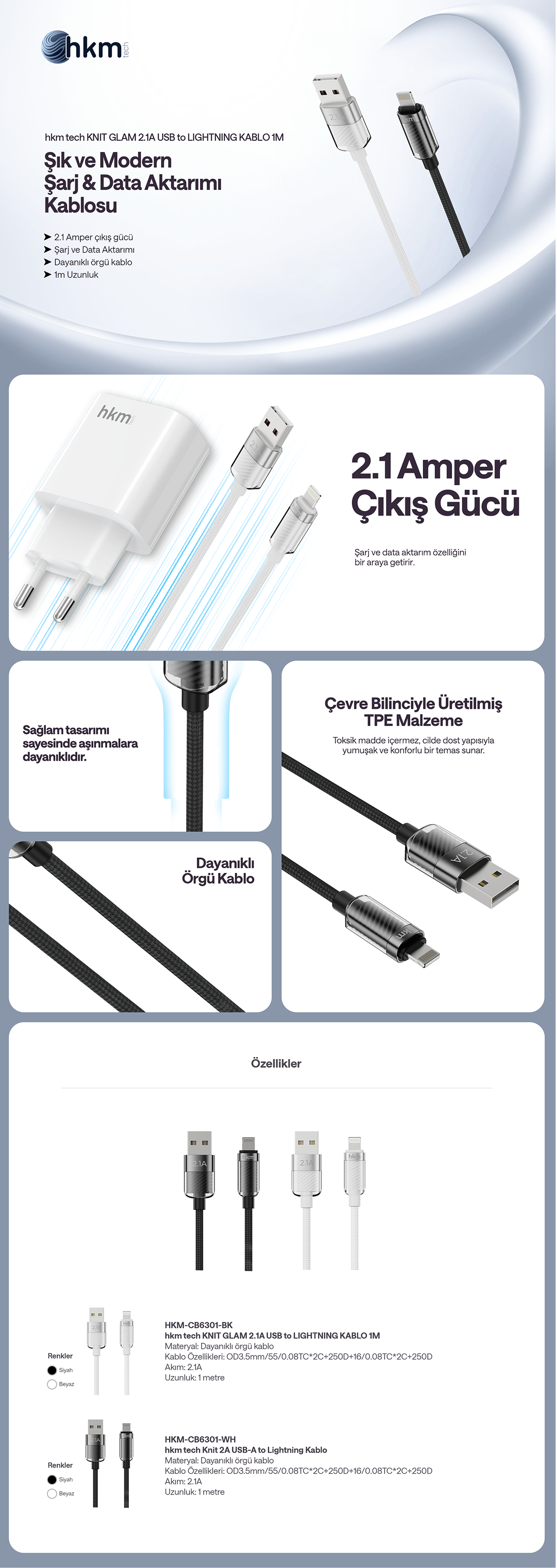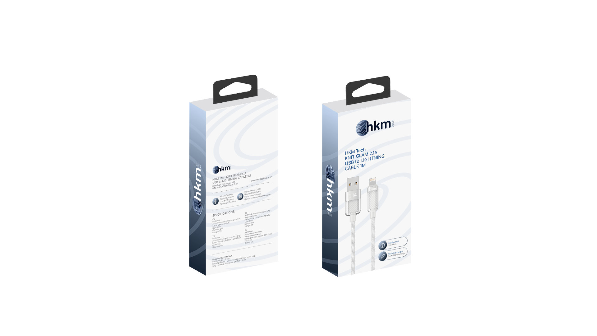 hkm Knit Glam 2.1A USB-A to Lightning Cable, zarif tasarımı ve sağlam yapısıyla Apple cihazlarınızı şarj etmek ve veri aktarmak için mükemmel bir tercihtir. Hem şıklığı hem de işlevselliğiyle her gün güvenle kullanabileceğiniz bir kablo!