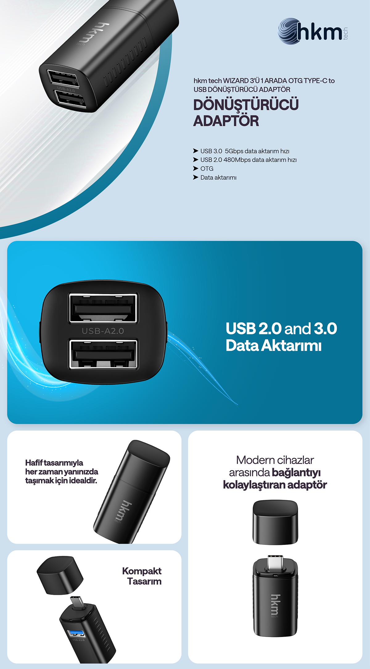 hkm tech WIZARD 3-in-1 Type-C to USB-A OTG Dönüştürücü Adaptör