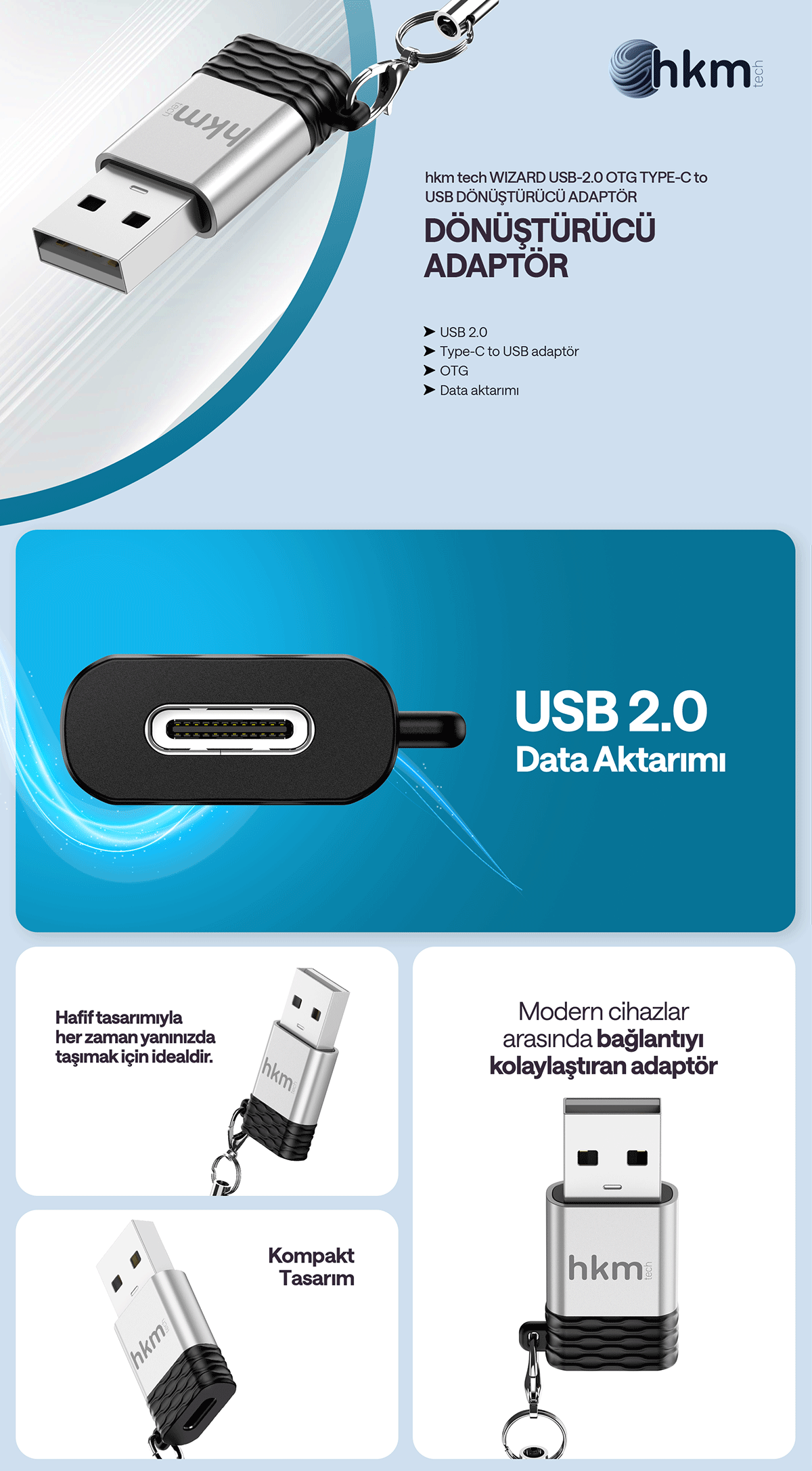 hkm Wizard USB-2.0 OTG Type-C to USB Adaptör, Kompakt tasarımı ve taşınabilirliğiyle her an yanınızda taşıyabileceğiniz bir bağlantı çözümüdür. Hem profesyonel kullanımda hem de günlük hayatınızda cihazlarınızı kolayca bağlayarak işlerinizi hızlandırır!